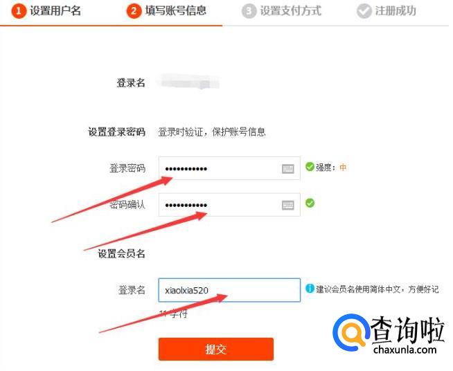 进入到“填写账号信息”界面,设置“登陆密码”,密码可以字母数字结合,这样保密性会更好,密码输入两次,然后设置“登陆户名”,再点击“提交”如图。