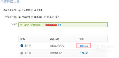 进入“淘宝开店认证”“支付宝实名认证”界面,点击后面的“重新认证”。