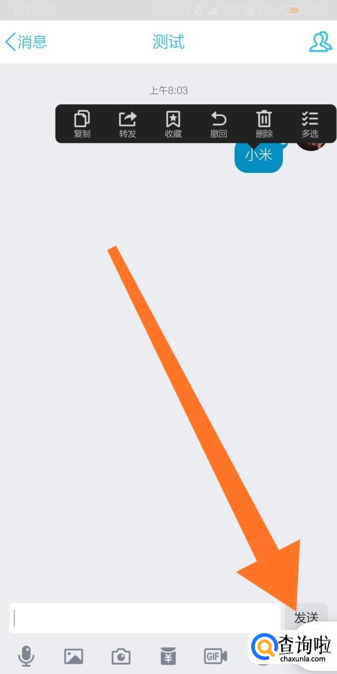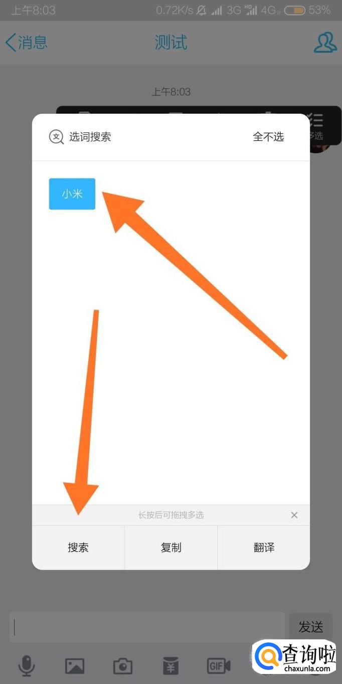 接下来随便打开一个聊天界面,长按聊天文字内容。也可以对手机屏幕任意感兴趣的文字内容长按选中。