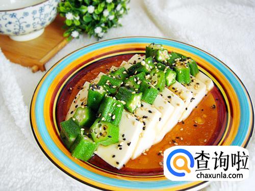 将秋葵洗净,热水中焯几分钟后捞出,切碎成块,然后将盒装嫩豆腐装盘切碎,撒上秋葵丁,最后淋上韩式辣酱和酱油调制成的美味酱汁,撒上芝麻,一道秋葵拌嫩豆腐就大功告成啦。这道菜非常爽口,很适合作为开胃凉拌菜食用。