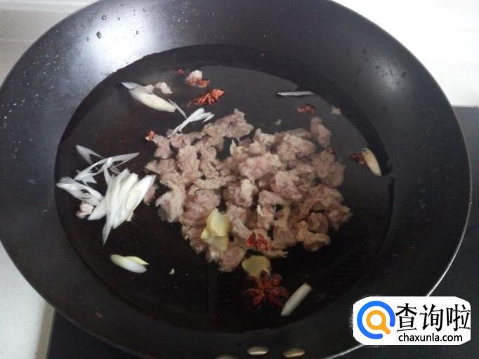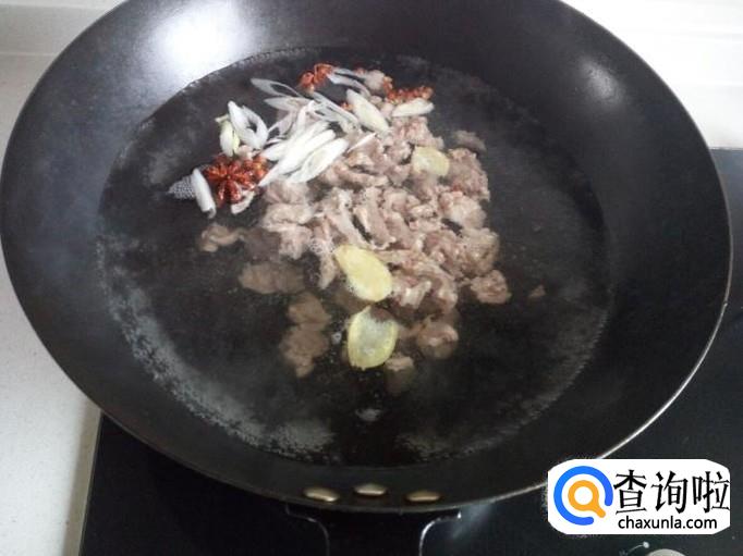 锅内重新放入水,把沥干水分的牛肉放入锅中。放入葱,姜,料酒,花椒,八角,大火烧开,转小火慢炖。