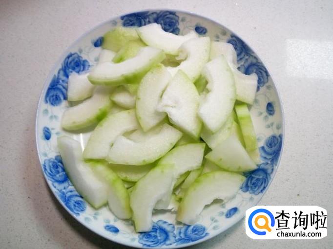 冬瓜去皮去瓤,用水清洗干净,切成0.5公分左右厚的片。
