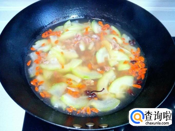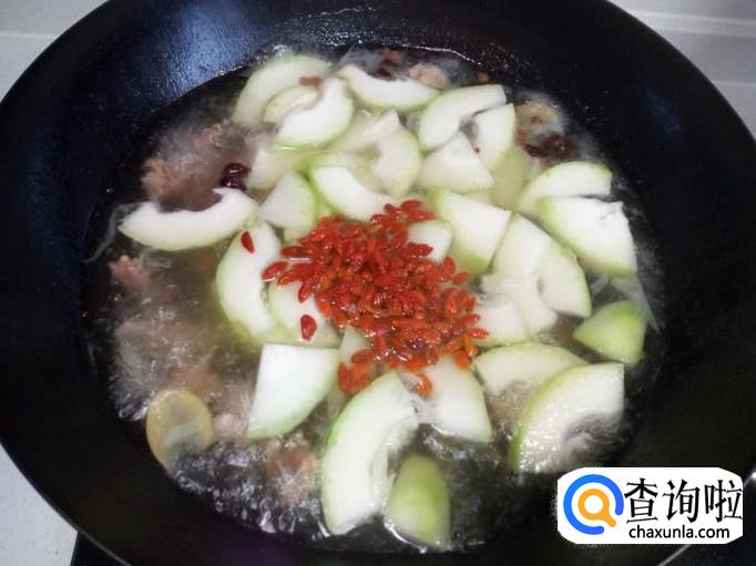 炖至牛肉烂糊后(大概一小时的时间),放入切好的冬瓜,枸杞,盐,转大火煮(如果汤少,适当加些水),大概煮十分钟的时间,冬瓜煮熟了即可,放入味精,关火。