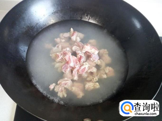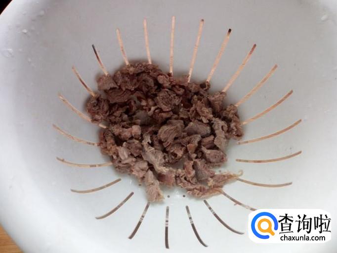 把牛肉放入开水中焯一下,水开后煮一分钟的时间捞出,用水冲洗干净(血水和沫子),沥干水分。