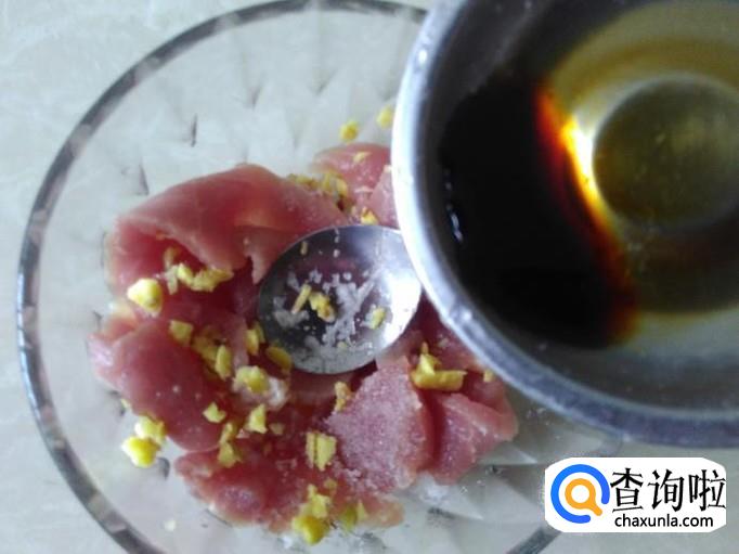 瘦肉切成薄片,加适量的盐、姜蓉、1勺生抽腌制几分钟。