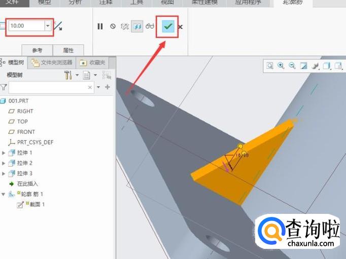设置筋厚度值,点击“绿色对勾”即可,如图所示。