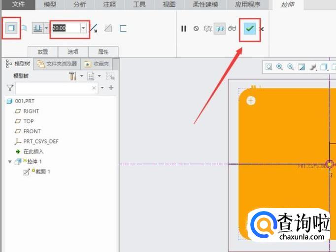 回到拉伸界面,设置拉伸参数,将其拉伸为实体,深度值为20,最后点击“绿色对勾”即可,如图所示。
