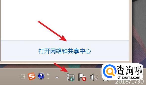 点击网络图标,再点击‘打开网络和共享中心’