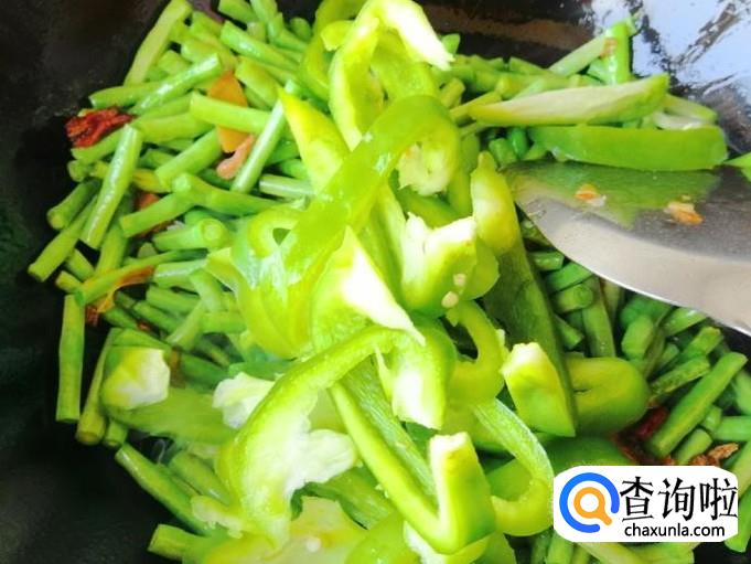 翻炒到豆角明显变软如图所示,加入早备好的菜椒,翻炒均匀,炒菜过程中要勤翻炒,不要离开以免炒糊,家里有老人孩子的可以用小火多闷一会。