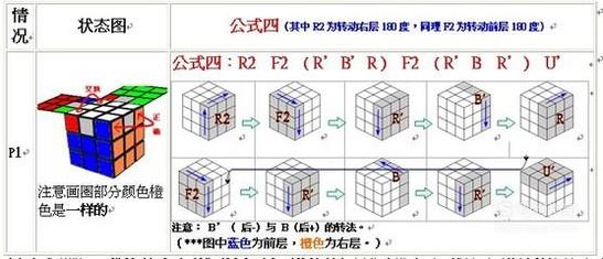 将两角同色的边要将黄色设为前面。两角同色的边放在右边。使用公式RRDDR'U'RD'D'R'UR'就可以将四面都换成同色的边。没有两角同色的边也是使用上面的公式,就会发现出现第一种情况。