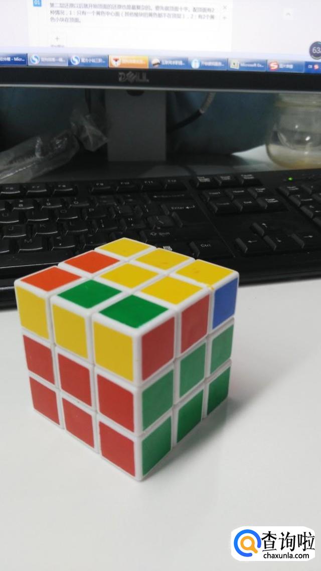 第二层还原以后就开始顶面的还原也是最复杂的。要先做顶面十字。配顶面有2种情况,1:只有一个黄色中心面(其他棱块的黄色都不在顶层),2:有2个黄色小块在顶面。