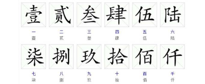 壹(1)、贰(2)、叁(3)、肆(4)、伍(5)、陆(6)、柒(7)、捌(8)、玖(9)、拾(10)、佰(100)、仟(1000)、万(10000)、亿(100000000)
