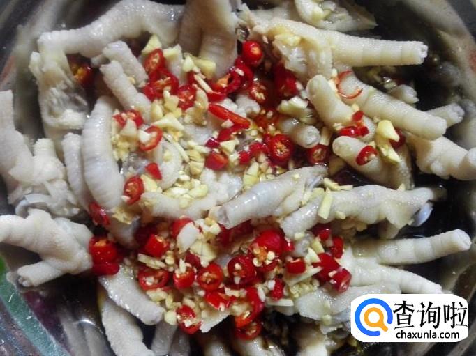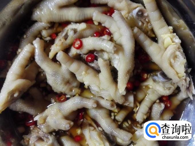 鸡爪500克、指天椒4只、蒜3瓣、香油1勺、生抽2勺、糖半勺、盐半勺、凉拌醋2勺、凉白开适量。