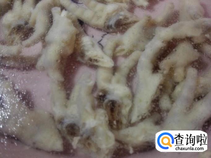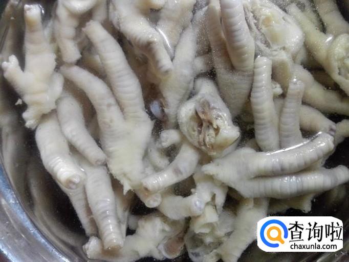 煮熟的鸡爪马上捞出过清水,以保持鸡爪Q弹的口感,顺便洗去鸡爪表面的浮末。
