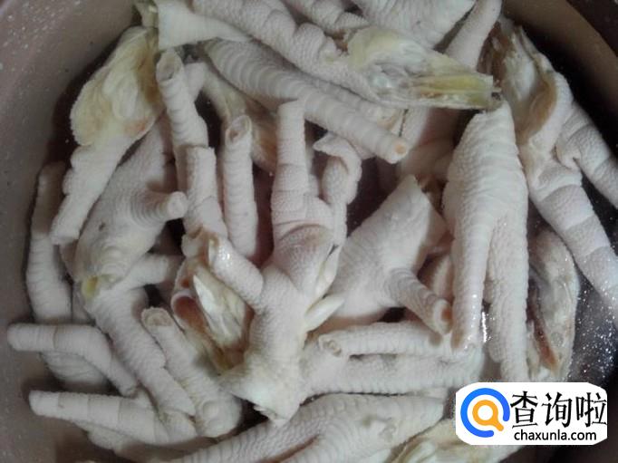 鸡爪冷水下锅,清水要没过鸡爪,大火烧开后再煮三分钟。可用筷子戳一下鸡爪,能轻易戳穿即可关火。