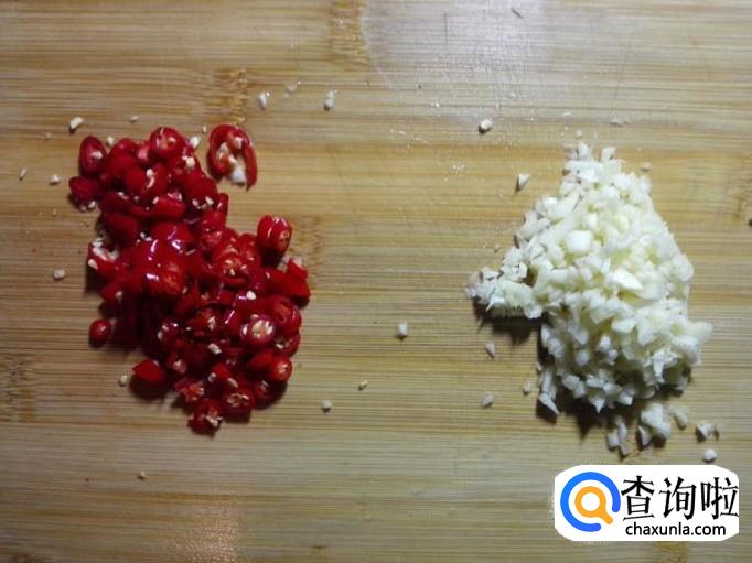 砧板清洗干净,将清洗干净的指天椒剁碎,蒜拍扁去底部同样剁碎,备用。