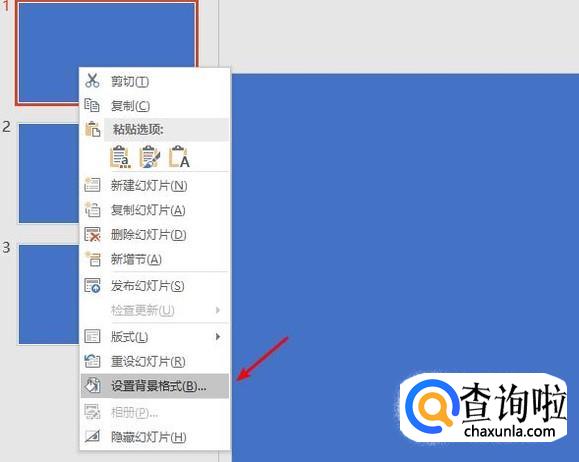 选择任意一张PPT,单击鼠标右键,选择设置背景格式