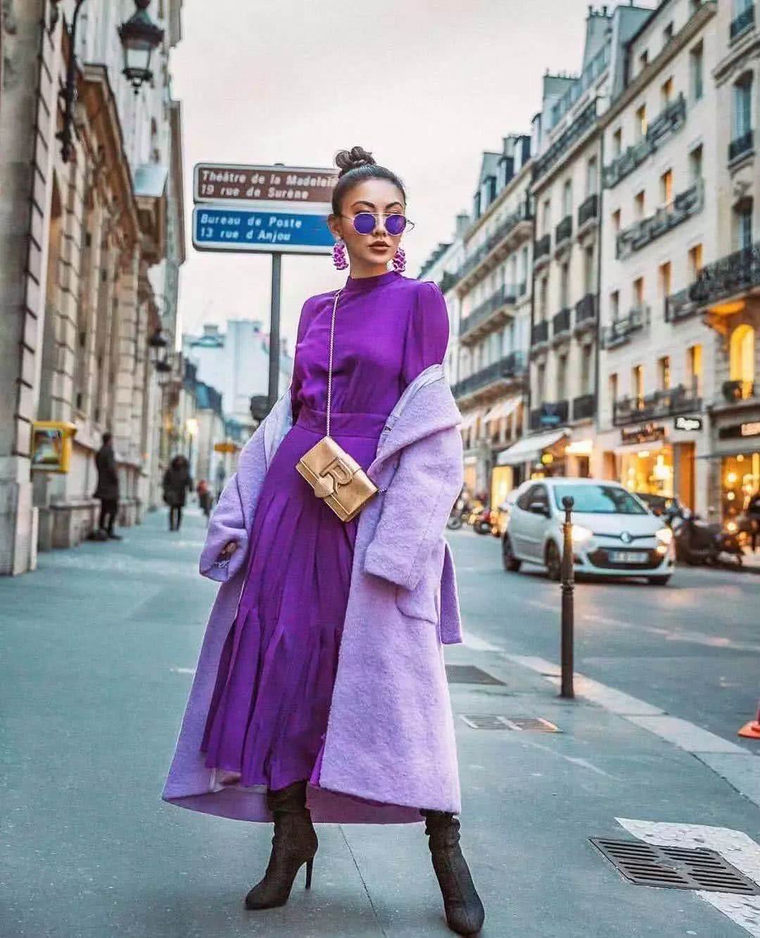 紫色是一种非常神秘的颜色,也是很多大牌设计师非常钟爱的色彩之一。紫色搭配白色永远不会出错,并且能形成强烈的对比,不仅能衬托肤色,而且完全不会花哨。紫色搭配黑色就显得中性帅气一些。这也是最保守的搭配方式,紫色的艳丽只有黑色能镇得住。