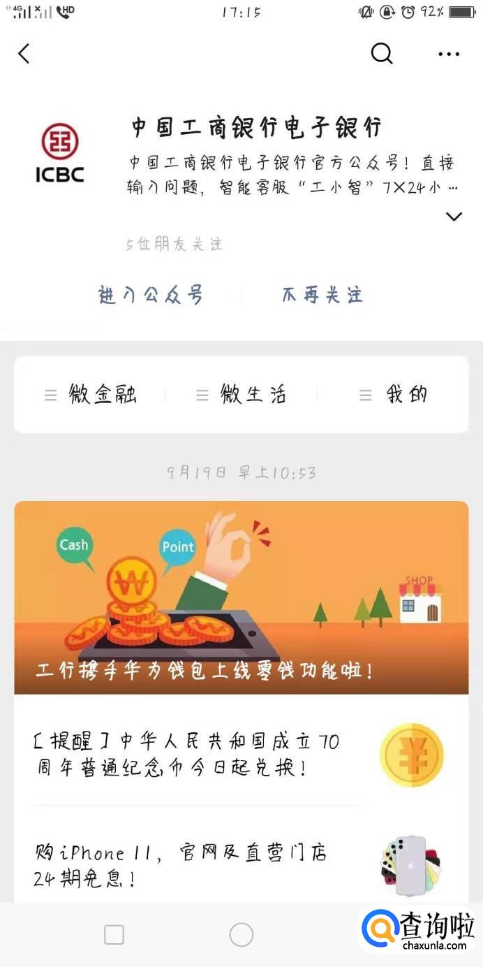 以工商银行为例,首先我们可以搜索公众号【工商银行】,然后点击【关注】。
