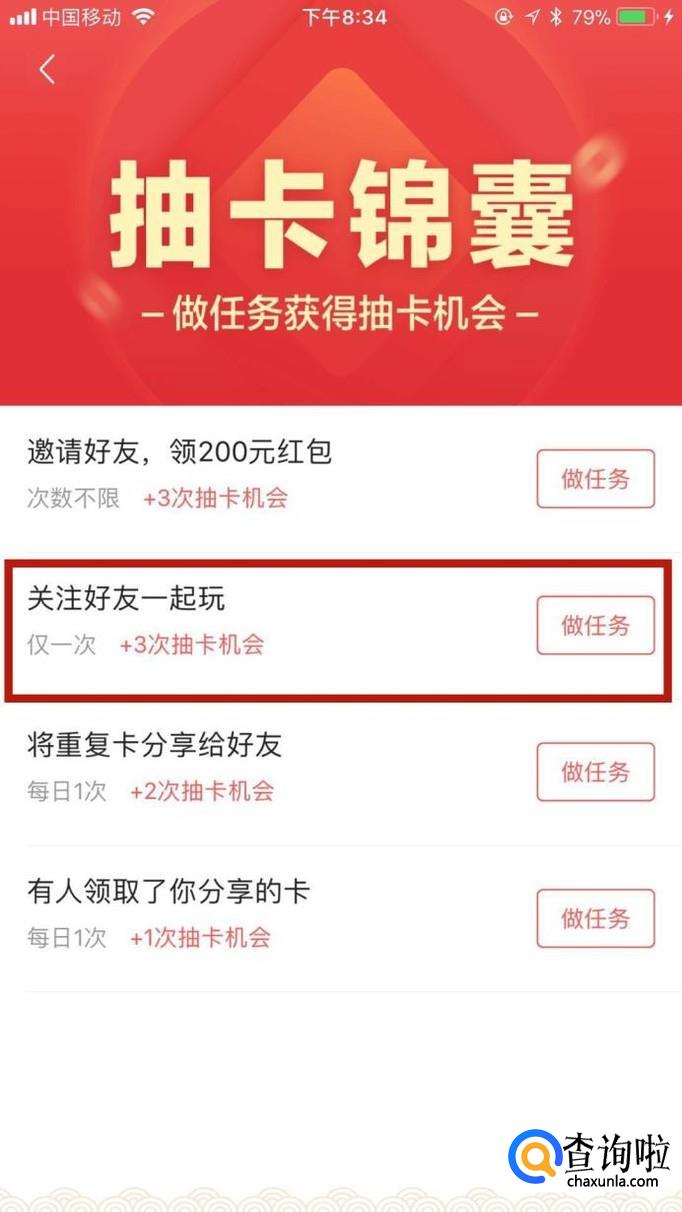 你也可以通过关注别人的号,获得三次抽卡机会,这里需要注意的是活动期间只能有一次这样的机会。