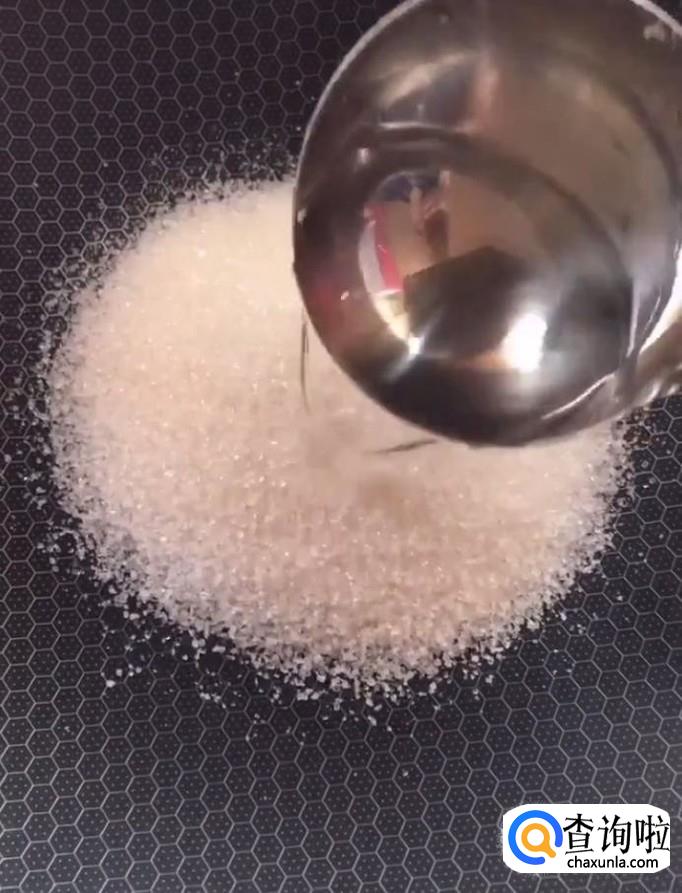 然后我们开始熬糖,在锅中放入一勺的白糖,大半勺的清水