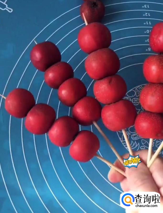 首先,我们将准备的好山楂清洗干净,依次用竹签子串起来,串几个都可以。备用