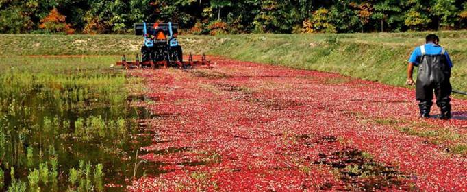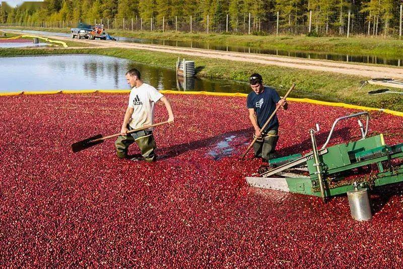 另外蔓越莓也是可以干收的,基本上用类似割草机的小型机器,然后将果实从树藤上采下来,收集起来装运输送即可。