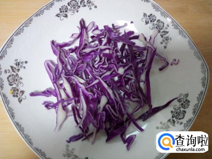 紫甘蓝用水清洗干净,控干水分,切成丝。