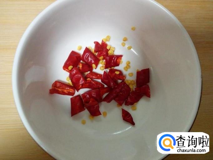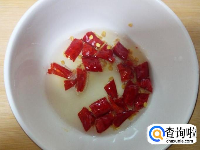 锅里放入油加热,油七,八成热时,关火。稍凉一些,倒入切好的红干椒碗中,炸成辣椒油。