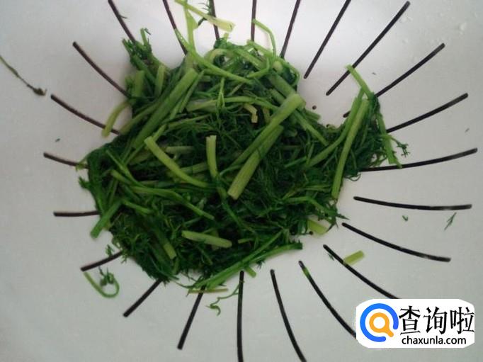 茴香用水焯一下,水开后入锅10秒钟捞出,迅速用冷水过凉,沥干水分,再用手攥一下上面的水分。