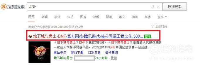 首先,使用搜狗搜索“DNF”,在搜索结果中,点击进入带有“官网”标识的网站。