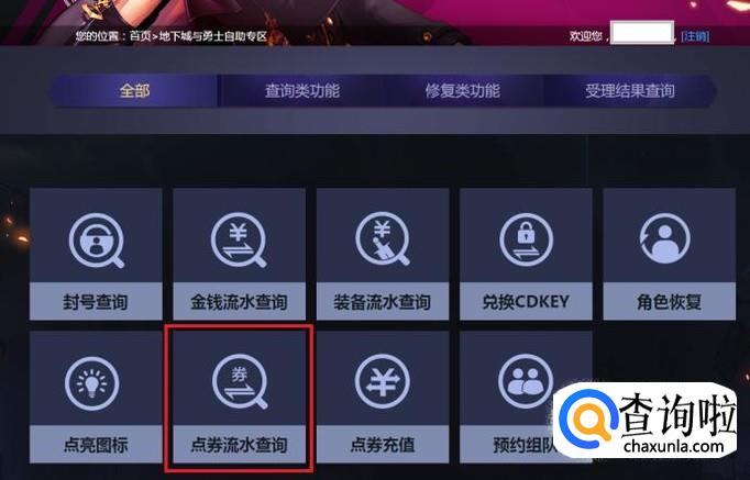 在地下城与勇士自助专区界面,点击“点券流水查询”选项。