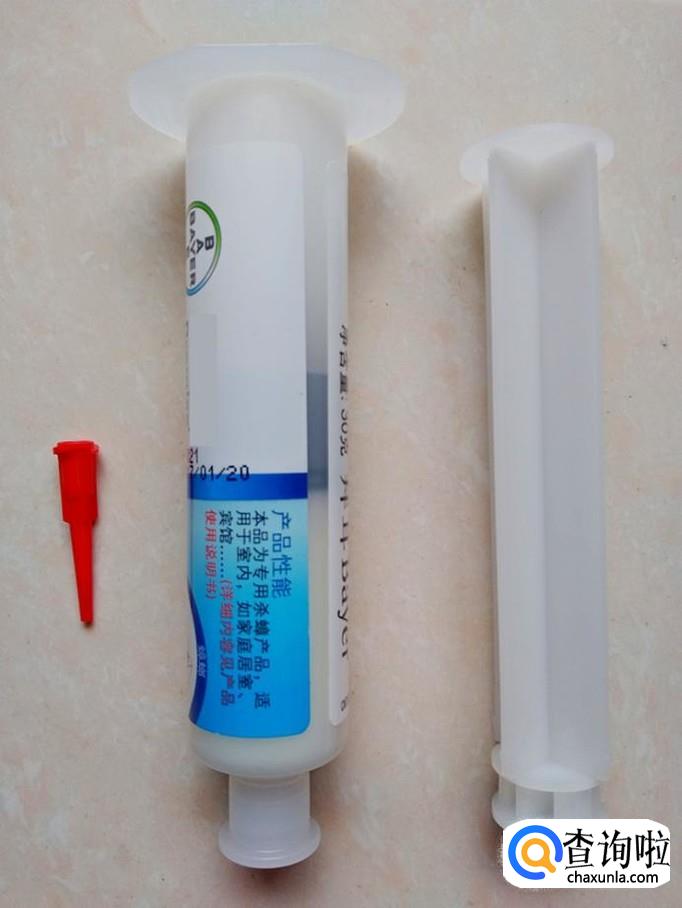首先购买外形类似针管的蟑螂饵胶套装,如图包括“针头”、装有饵胶的“针筒”和推杆;
