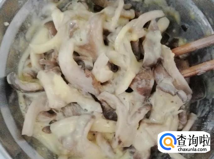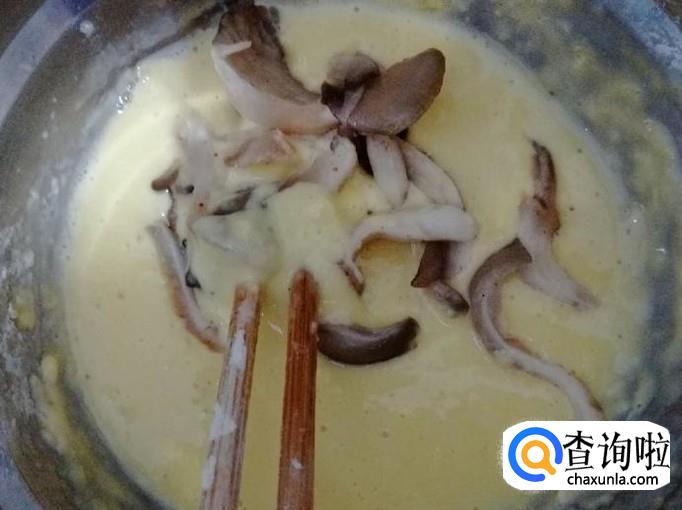 把用盐和五香粉腌好的蘑菇,取适量放入面糊中,让蘑菇外面均匀裹上面糊,调的面糊和蘑菇,比例匹配的话,可以把蘑菇都加入面糊中,搅拌均匀。