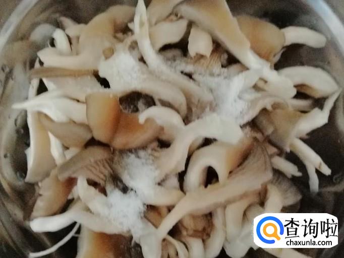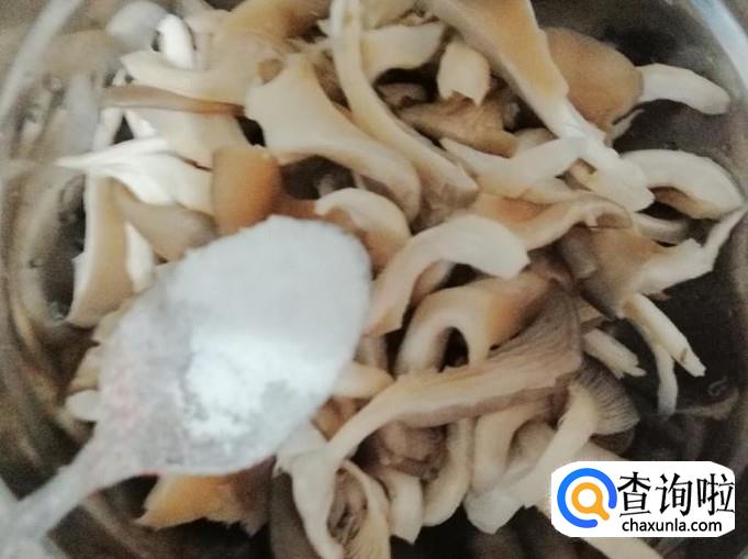 蘑菇控水后,再撒熟了盐,杀一下蘑菇水,用手攥挤掉蘑菇多余水份,然后放入少许盐腌一会蘑菇。