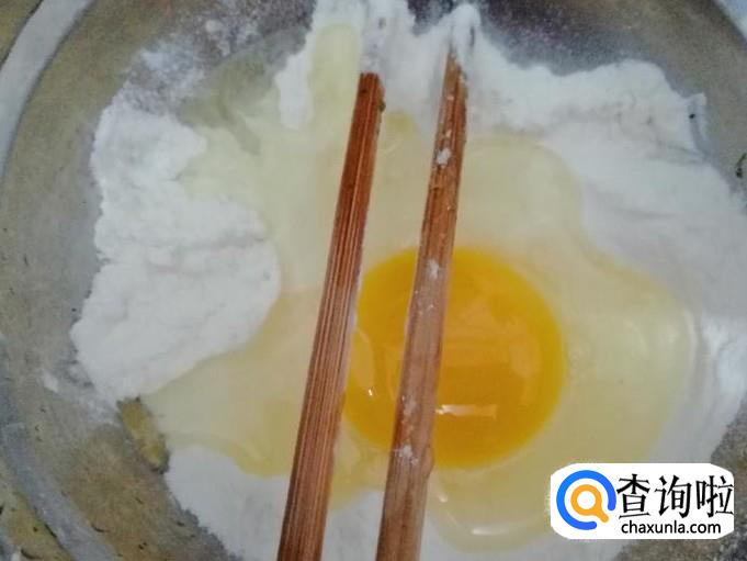 取适量面粉,把洗净的鸡蛋磕入碗中,用筷子搅拌均匀,一个鸡蛋基本,就可以把面糊调好,如果面糊稠的话,可以加入适量水,面糊调好待用。