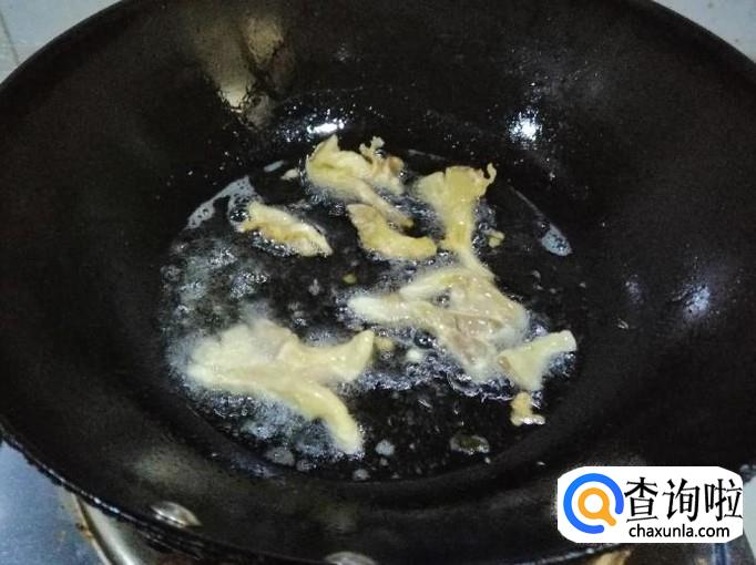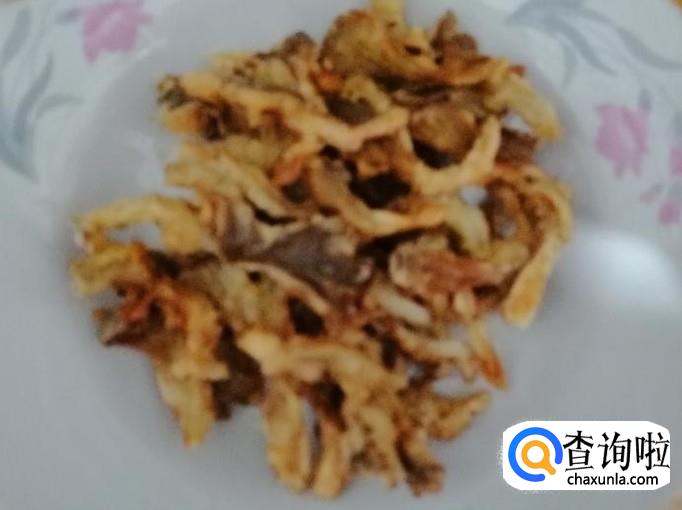 炒锅放油,油热后放入几块,裹满鸡蛋面糊的蘑菇,小火慢炸,用筷子勤搅动锅中的蘑菇,炸至两面金黄就可以了。