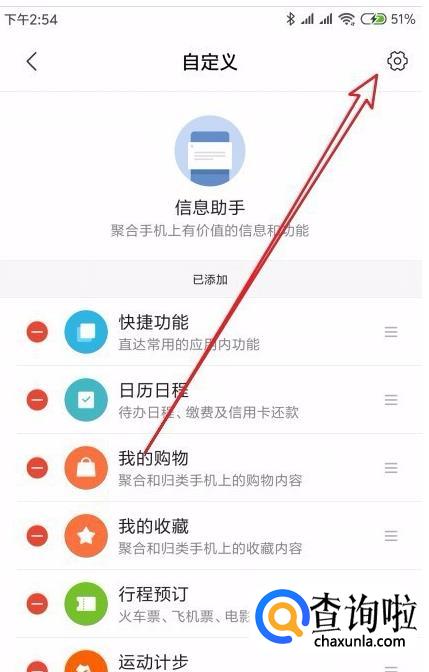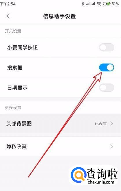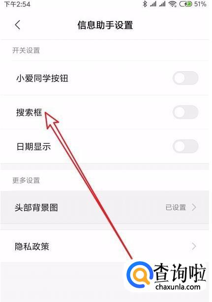 点击进入信息助手设置选项,在开关设置分类下找到搜索框功能选项。