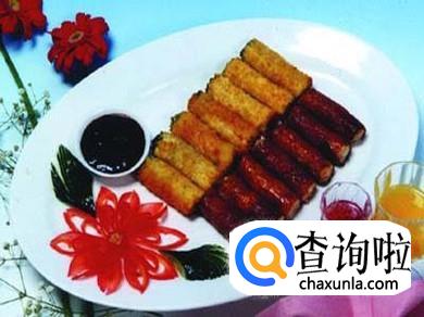双味鸭卷,又名比翼双飞。其主材由烤鸭皮和鸡蛋皮制成,吃起来外焦里嫩。同时由于其双色双味,因此寓意新郎新娘在以后的生活中比翼双飞,同甘共苦,富贵同进之意