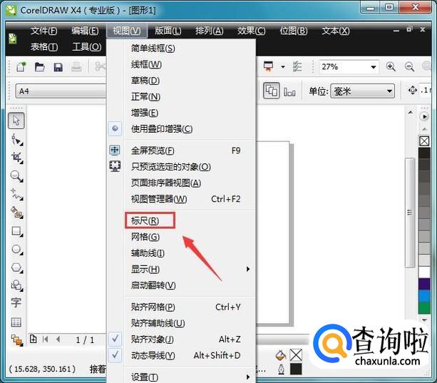 我们在菜单里找到视图选项,点击该选项在其内找到标尺选项,如图所示: