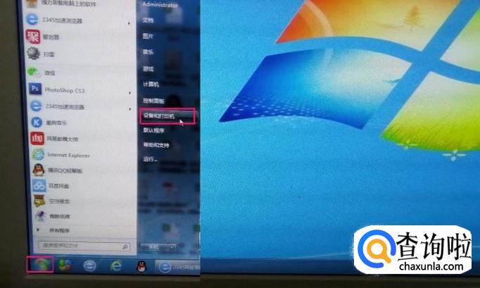 点击电脑左下角“开始”栏,出现下图的对话框后点击“设备和打印机”。