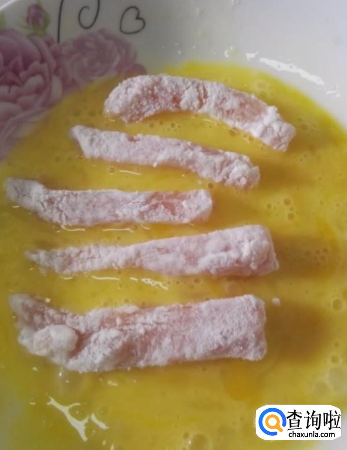 然后我们再把里脊肉放入鸡蛋液中裹一层鸡蛋液,再裹一层面包糠,全部裹好以后备用