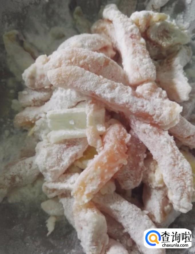 接着我们将腌制好的里脊肉均匀的裹上一层淀粉
