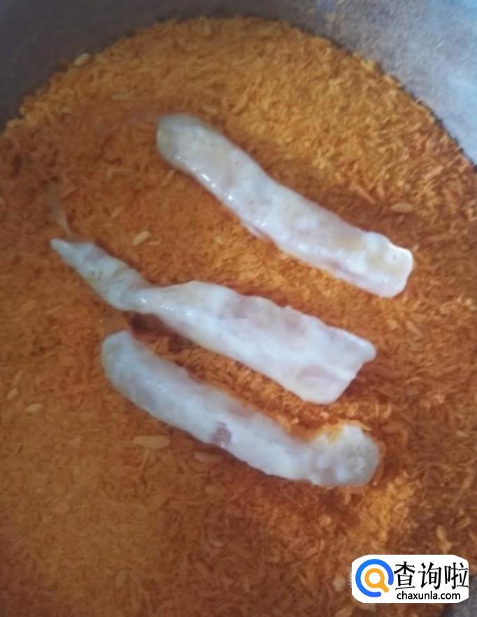 接着我们起锅烧油,油温五成热下入里脊肉,炸至外表金黄酥脆捞出控油