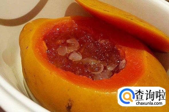 木瓜炖桃胶,桃胶提前一个晚上泡发,洗干净,挑去杂物,木瓜去籽挖洞,把泡发好的桃胶倒入蒸锅蒸30分钟,取出后倒入木瓜,下冰糖再蒸20分钟即可。