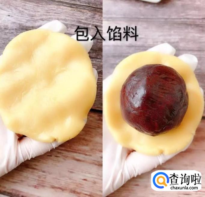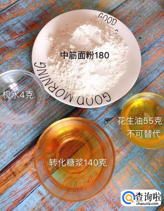 食材:中筋面粉180克,枧水4克,转化糖浆140克,花生油55克,蛋黄适量,白酒适量,豆沙适量。