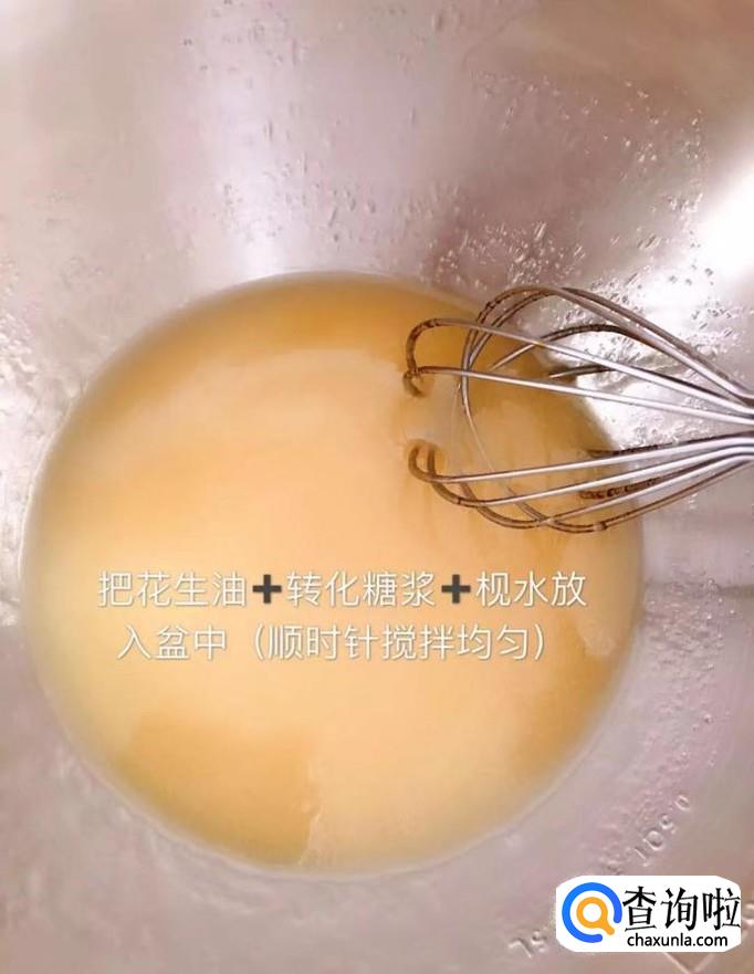 首先将花生油,转化糖浆和枧水放入盆中,顺时针搅拌均匀,如下图所示。