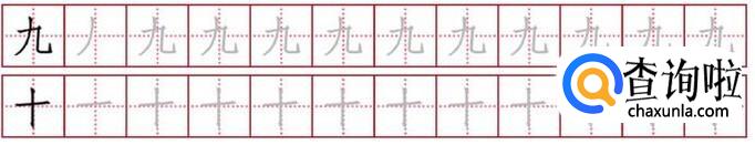 九的笔画是:撇,横折折勾。十的笔画是:横,竖。
