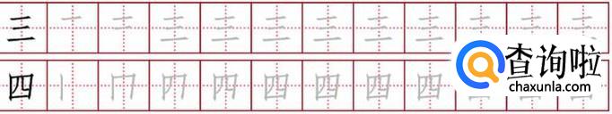 三的笔画是:一横,一横,一横。四的笔画是:竖,横折,撇,竖折,横。