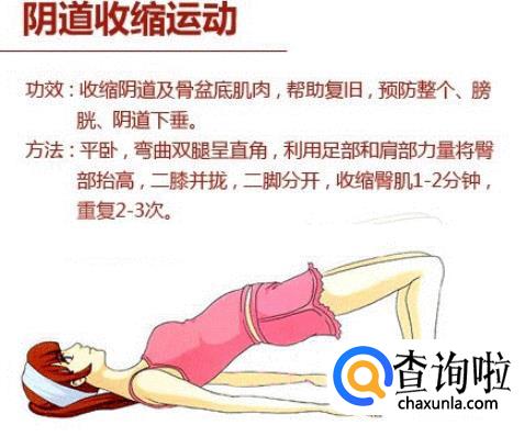 保持平卧姿势,两腿弯曲至直角状,通过脚部及肩部力量抬升臀部,两腿膝盖合拢,两脚分离,收缩臀肌1~2分钟即可,继续重复2到3次。这样可以促进下体和骨盆底肌肉收缩,利于恢复,避免出现膀胱或下体下垂的情况。